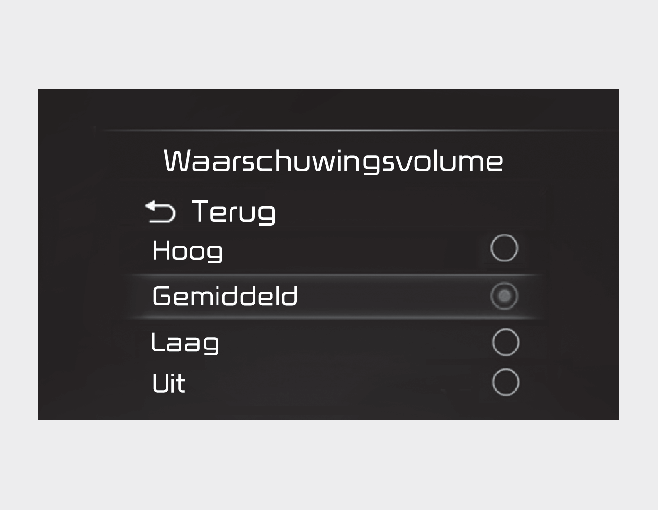 Zelfs als ‘Off’ (‘Uit’) wordt geselecteerd, wordt het waarschuwingsvolume van de ondersteuning botsing vermijden voorzijde (FCA) echter niet helemaal uitgeschakeld, maar klinkt het volume zoals bij de instelling ‘laag’.