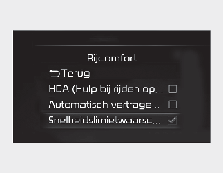 Als 'Speed Limit Warning (waarschuwing snelheidslimiet)' is geselecteerd, informeert het systeem de bestuurder over de snelheidslimiet. Bovendien waarschuwt de functie de bestuurder wanneer de auto harder rijdt dan de snelheidslimiet.