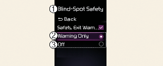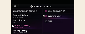 With the engine on, select or deselect 'Driver Assistance → Blind Spot Safety' from the Settings menu to set whether or not to use each function.