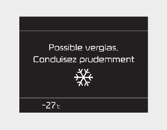 Si l'avertissement de route verglacée s’affiche pendant que vous conduisez, vous devez conduire plus attentivement et prudemment en ne roulant pas trop vite, en évitant les accélérations brusques, les coups de frein ou les virages brusques, etc.