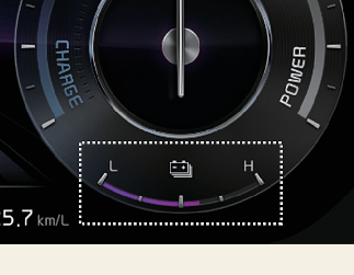 يُشير هذا المقياس إلى طاقة البطارية الهجينة المتبقية. في حالة اقتراب حالة الشحن من المستوى "L (منخفض)"، تعمل السيارة تلقائيًا على تشغيل المحرك لشحن البطارية.
