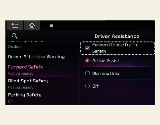 عندما يكون المحرك قيد التشغيل حدد "مساعدة السائق ← سلامة السيارة من الأمام" من قائمة الإعدادات لتحديد استخدام كل وظيفة من عدمه.