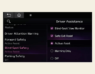 عندما يكون المحرك قيد التشغيل، حدد أو ألغ تحديد "مساعدة السائق ← أمان المركبة في المنطقة المحجوبة" من قائمة الإعدادات لتحديد استخدام كل وظيفة من عدمه.