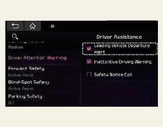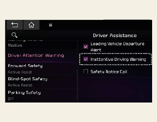 عندما يكون المحرك قيد التشغيل، حدد أو ألغ تحديد "مساعدة السائق ← Driver Attention Warning (أو DAW (Driver Attention Warning)) (التحذير بشأن تشتت انتباه السائق)" من قائمة الإعدادات لتحديد استخدام كل وظيفة من عدمه.