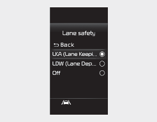 If ‘LDW (Lane Departure Warning)' is selected, Lane Keeping Assist will warn the driver with an audible warning when lane departure is detected. The driver must steer the vehicle.