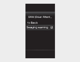 If ‘Swaying warning’ is selected, the function will inform the driver the driver’s attention level and will recommend taking a break when the level falls below a certain level. When the engine is restarted, Inattentive Driving Warning will always turn on.