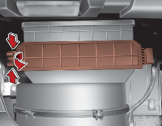 The climate control air filter should be replaced according to the maintenance schedule. If the vehicle is operated in severely air-polluted cities or on dusty rough roads for a long period, it should be inspected more frequently and replaced earlier. When you replace the climate control air filter, replace it performing the following procedure, and be careful to avoid damaging other components.