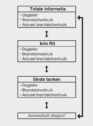 Als er meer dan 6 liter is getankt en er harder dan 1 km/u wordt gereden, wordt het display Sinds tanken automatisch gerest naar de standaardwaarden.