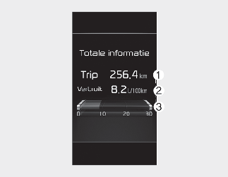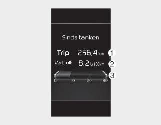 Het display toont de geaccumuleerde ritafstand (1), het gemiddelde brandstofverbruik (2) en het actuele brandstofverbruik (3).