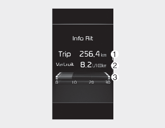 Het display toont de ritafstand (1), het gemiddelde brandstofverbruik (2) en het actuele brandstofverbruik (3) voor iedere cyclus tussen het in- en uitschakelen van de motor.