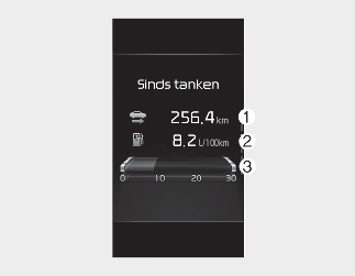 Het display toont de geaccumuleerde ritafstand (1), het gemiddelde brandstofverbruik (2) en het actuele brandstofverbruik (3) na het tanken.