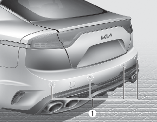 De parkeersensoren voor/achter waarschuwen de bestuurder als er personen, dieren of objecten worden gedetecteerd door de ultrasoonsensoren aan de voor-/achterzijde (1) terwijl de auto langzaam vooruit- of achteruitrijdt