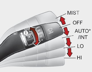 INT / ---: De ruitenwissers werken met regelmatige intervallen. Gebruik deze stand bij motregen of mist. Draai aan de snelheidsregelknop (1) om de snelheid te wijzigen.
