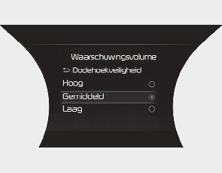 Selecteer, terwijl de toets ENGINE START/STOP (motor starten/stoppen) in de stand ON staat, ‘Bestuurdershulp → Waarschuwingsvolume’ in “Gebruikersinstellingen (LCD-scherm) of het menu Instellingen → Voertuig (Infotainmentsysteemscherm)” om het waarschuwingsvolume voor Blind-Spot Collision-Avoidance Assist te wijzigen in ‘Hoog’, ‘Gemiddeld’ of ‘Laag’.