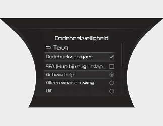 Als u de instelling wijzigt van 'Off' ('Uit') naar 'Active Assist’ ('Actieve hulp’) of 'Warning Only’ ('Alleen waarschuwing’), knippert het waarschuwingslampje op de buitenspiegel gedurende drie seconden.