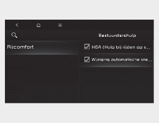 Met draaiende motor selecteert u 'Driver Assistance → Driving Assist → Highway Auto Speed Change ' ('Bestuurdershulp → Rijassistentie → Snelheid automatisch veranderen op de snelweg') in het Settings (instellingen) menu om Navigation-based Smart Cruise Control (slimme cruise controle op basis van navigatie) te selecteren, en te deselecteren om de functie uit te zetten.
