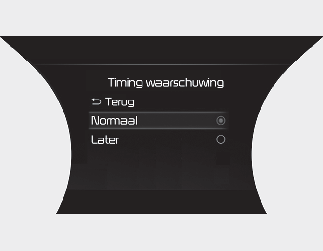 Wanneer u uw auto in ontvangst neemt, is het waarschuwingsmoment ingesteld op ‘Normaal’. Als u het waarschuwingsmoment wijzigt, kan ook het waarschuwingsmoment van andere bestuurdershulpfuncties veranderen.