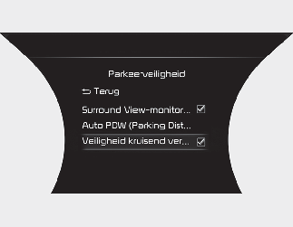 Terwijl de toets ENGINE START/STOP in de stand ON staat, selecteert u 'Bestuurdershulp → Parkeerveiligheid → Veiligheid kruisend verkeer achteraan' in “Gebruikersinstellingen" (LCD-scherm) of het menu "Instellingen → Voertuig" (Infotainmentsysteemscherm) om het Rear Cross-Collision Warning-systeem in te schakelen en maakt u de selectie ongedaan om het systeem uit te schakelen.