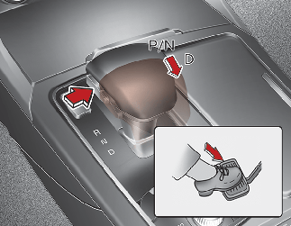 Beweeg de selectiehendel naar R (achteruit) of D (rijden) terwijl u drukt op de toets [UNLOCK] (ontgrendelen).