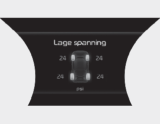 Wanneer de waarschuwingslampjes van het controlesysteem lage bandenspanning branden en er een waarschuwingsmelding op het LCD-scherm in het instrumentenpaneel wordt weergegeven, is de bandenspanning van een of meerdere banden te laag.