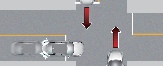 La función de giro en cruce ayudará a evitar una colisión con un vehículo que circula de frente por un carril adyacente al girar a la izquierda (conducción a la izquierda) o a la derecha (conducción a la derecha) en un cruce con el intermitente activado mediante el accionamiento del freno de emergencia.