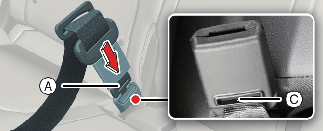 Da biste uvukli središnji sigurnosni pojas na stražnjem sjedalu, umetnite pločicu s jezičkom ili sličnu krutu napravicu u otvor za otpuštanje remena (C). Povucite remen sigurnosnog pojasa (A) prema gore i pustite da se remen automatski uvuče.