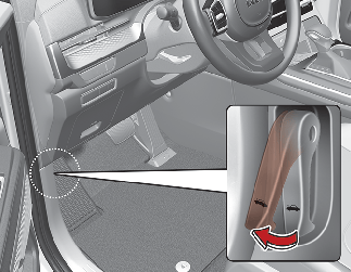 Go to the front of the vehicle, raise the hood slightly, push the Secondary hood release lever (1) to the left and lift the