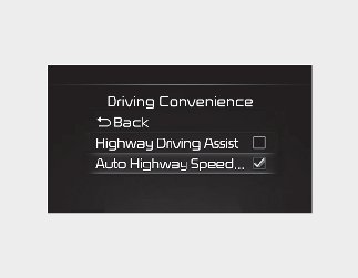 With the engine on, select 'Driver Assistance → Driving Convenience → Highway Auto Speed Change' from the Settings menu to turn on Navigation-based Smart Cruise Control and deselect to turn off the function.