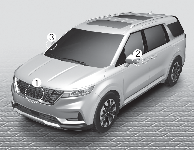 (1) Wide-front view camera, (2, 3) Wide-side view camera (under the outside rearview mirror)