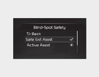 With the engine on, select 'Driver Assistance → Blind-Spot Safety → Safe Exit Assist (SEA) (or SEA (Safe Exit Assist)' from the Settings menu to turn on Safe Exit Assist and deselect to turn off the function.