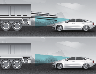 If the vehicle in front of you has cargo that extends rearward from the cab, or when the vehicle in front of you has higher ground clearance, additional special attention is required. Forward Collision-Avoidance Assist may not be able to detect the cargo extending from the vehicle. In these instances, you must maintain a safe braking distance from the rearmost object, and if necessary, steer your vehicle and depress the brake pedal to reduce your driving speed in order to maintain distance.