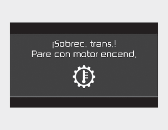 Si se sigue conduciendo el vehículo y las temperaturas del embrague alcanzan el límite máximo de la temperatura, se mostrará la advertencia "Transmission Hot! Park with engine on" (¡Sobrec. trans.! Pare con motor encend.). Cuando esto ocurre, el embrague se desactiva hasta que se enfría de nuevo a una temperatura normal.