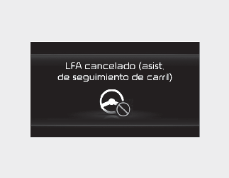 Si el conductor aún no tiene las manos en el volante después del aviso de sin manos, el mensaje de aviso "Lane Following Assist (LFA) canceled" (Asistencia de seguimiento de carril (LFA) cancelada) desaparecerá y la asistencia de seguimiento del carril se cancelará automáticamente.