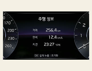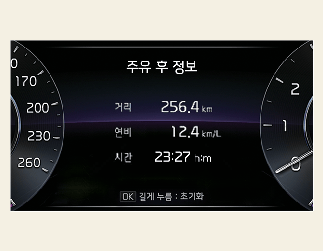 주유 후 연비(주유할 때마다): 연료를 주입하거나 주유 후 연비가 표시된 상태에서「OK」버튼을 약 1초 이상 누르면 초기화됩니다.