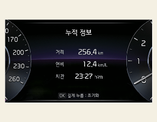 누적 연비: 누적 연비가 표시된 상태에서「OK」버튼을 약 1초 이상 누르면 초기화됩니다.