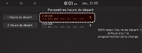 Heure de début : réglez l'heure à laquelle vous souhaitez démarrer le véhicule après avoir chargé la batterie.