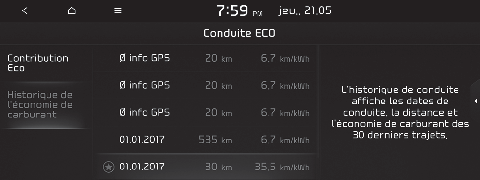 Vous pouvez vérifier les informations du niveau ECO ainsi que l’historique de la conduite ECO.