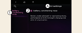 Der Batteriezustandsmodus ist zur Winterzeit wirksam, wenn die Temperatur der Hochspannungsbatterie niedrig ist. Dieser Modus wird empfohlen, um die Fahrleistung und die Gleichstrom-Ladeleistung im Winter zu verbessern. Die Reichweite kann sich jedoch verringern, da die Energie zur Erhöhung der Batterietemperatur benötigt wird.