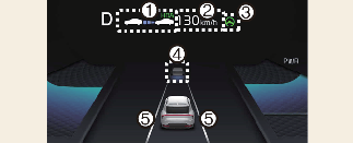 Die Fahrspurmarkierung wird ebenso angezeigt wie die Anzeige für die Autobahn-Fahrspurwechselhilfe (1). Die Verfügbarkeit der Fahrspurerkennung wird jedoch im Standby-Zustand angezeigt.