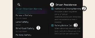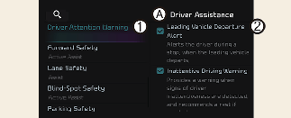 Wählen Sie bei eingeschaltetem Fahrzeug Einstellungen → Fahrzeug → Fahrerassistenz → DAW (Fahreraufmerksamkeitswarnsystem) auf dem Bildschirm des Infotainmentsystems, um festzulegen, ob die jeweilige Funktion verwendet werden soll.