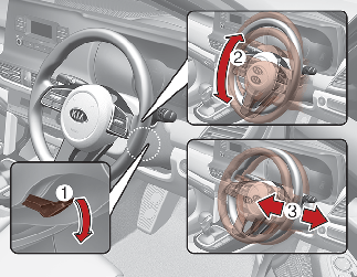 Adjust the steering wheel to the desired angle (2) and height (3, if equipped).