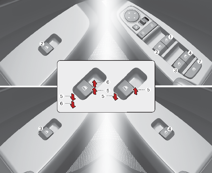 Each door has a power window switch that controls the door's window. The driver has a power window lock button which can block the operation of rear passenger windows. The power windows can be operated for approximately 10 minutes after the ignition key is removed or turned to the ACC or LOCK position. However, if the front doors are opened, the power windows cannot be operated even within the 10 minutes period.