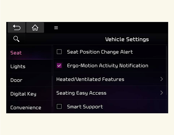 Select 'Setup → Vehicle Settings → Seat → Ergo-Motion Seat → Smart Support' from the Settings menu in the infotainment system screen to activate or deactivate Smart support function.