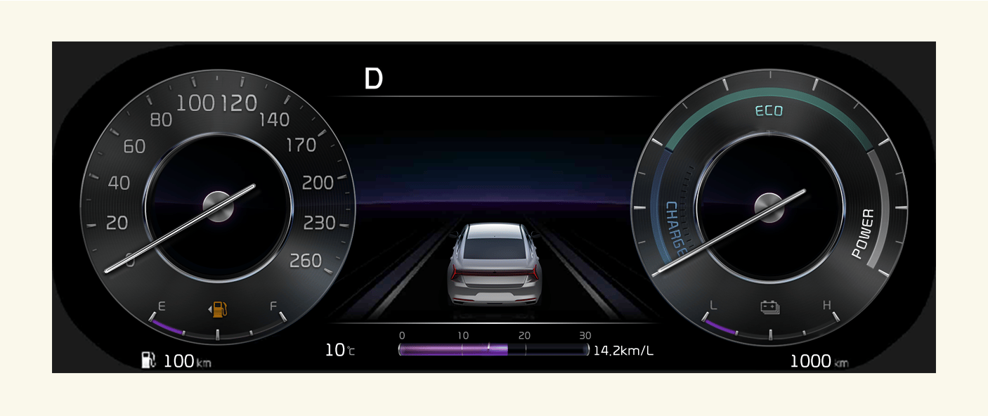 Type A is the basic theme of the full LCD type cluster and provides different graphic styles depending on drive mode.