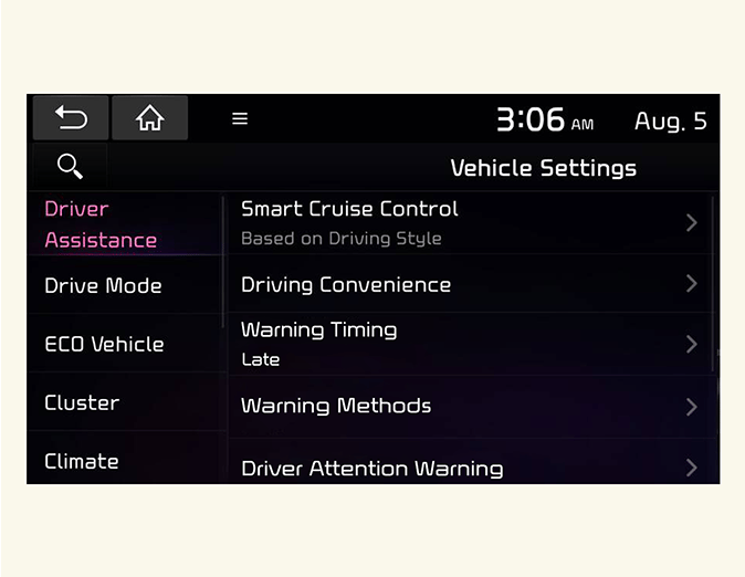 Driver assistance settings (infotainment system)