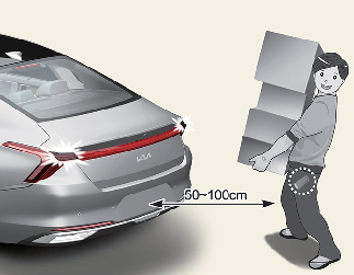 If you are positioned in the detecting area (50 ~100 cm behind the vehicle) carrying a smart key, the hazard warning lights will blink and chime will sound to alert you the smart key has been detected and the trunk will open.