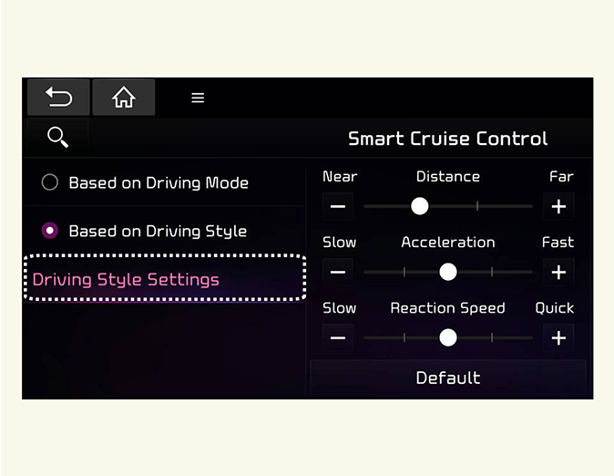 Driving Style Settings (if equipped) With the engine on, select 'Driver Assistance → Smart Cruise Control → Driving Style Settings' from the Settings menu to check the driver's driving style, and to change each driving style manually.