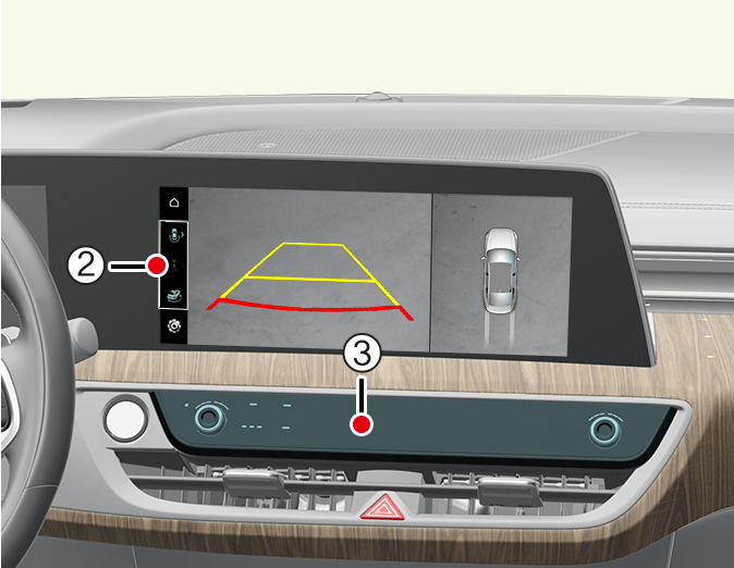 While the infotainment system screen is being displayed, press the Parking/View button (1) briefly when the gear is in D (Drive) or N (Neutral) and vehicle speed is below 10 km/h (6 mph).