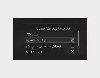 عندما يكون زر Engine Start/Stop (بدء تشغيل/ إيقاف المحرك) في الوضع ON (تشغيل)، حدد "Driver Assistance ← (مساعدة السائق) ← Blind-Spot Safety (السلامة في المنطقة المحجوبة) ← Blind Spot View (عرض المنطقة المحجوبة)" من قائمة Settings (الإعدادات) لتشغيل نظام مراقبة عرض المنطقة المحجوبة وإلغاء تحديدها لإيقاف تشغيل النظام.