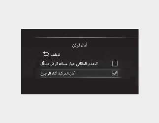عندما يكون زر ENGINE START/STOP (بدء تشغيل/ إيقاف المحرك) على الوضع "ON" (تشغيل)، حدد "Driver Assistance (مساعدة السائق) ← Parking Safety (أمان الركن) ← Rear Cross-Traffic Safety (أمان المركبة أثناء الرجوع)" من قائمة الإعدادات لتشغيل نظام المساعدة على تجنب الاصطدام أثناء الرجوع وألغ التحديد لإيقاف تشغيل الوظيفة.